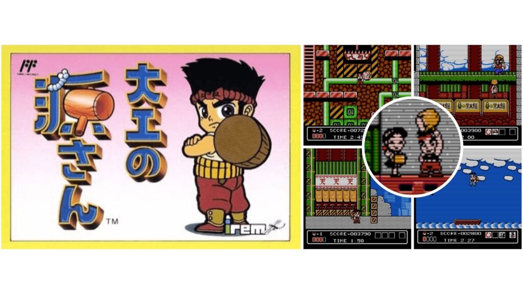 Um título curioso lançado pela Irem Corporation, no final da vida do Famicom, em 1991. Daiku no Gen-san, pode ser traduzido como Carpinteiro Gen, tem uma história bem simples. Para defender que os agentes do governo não ponham as casas de sua cidade abaixo para criar prédios enormes, Gen-san pega sua marreta para expulsá-los à força do local.